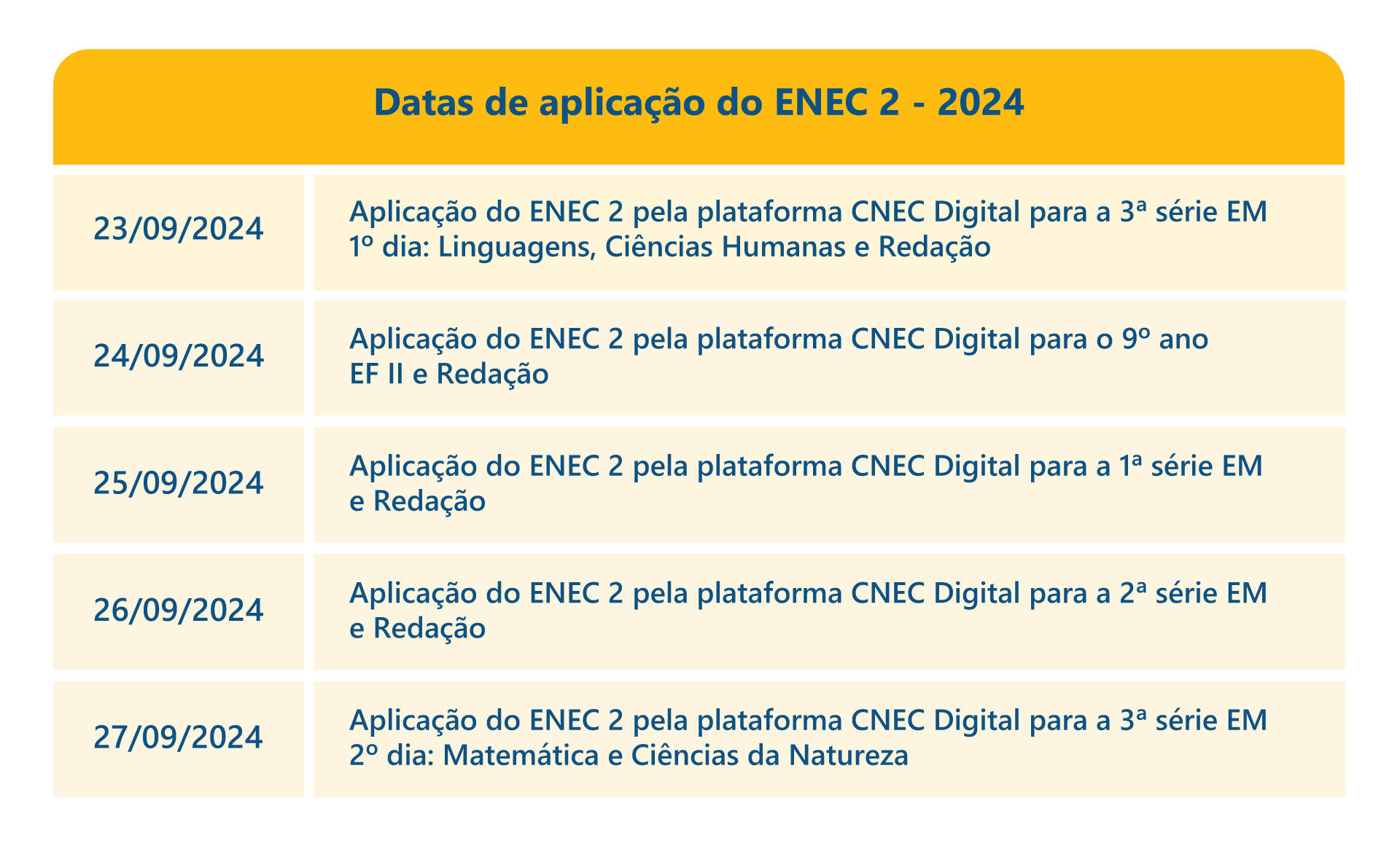 As aplicações do exame terão início a partir do dia 23 de setembro, para todos os alunos da rede CNEC, do 9º ano do Ensino Fundamental II até a 3ª série do Ensino Médio. Cada ano/série fará a prova em uma data diferente, com foco nos conhecimentos adquiridos pelos alunos nas áreas de Linguagens, Matemática, Ciências da Natureza e Ciências Humanas.