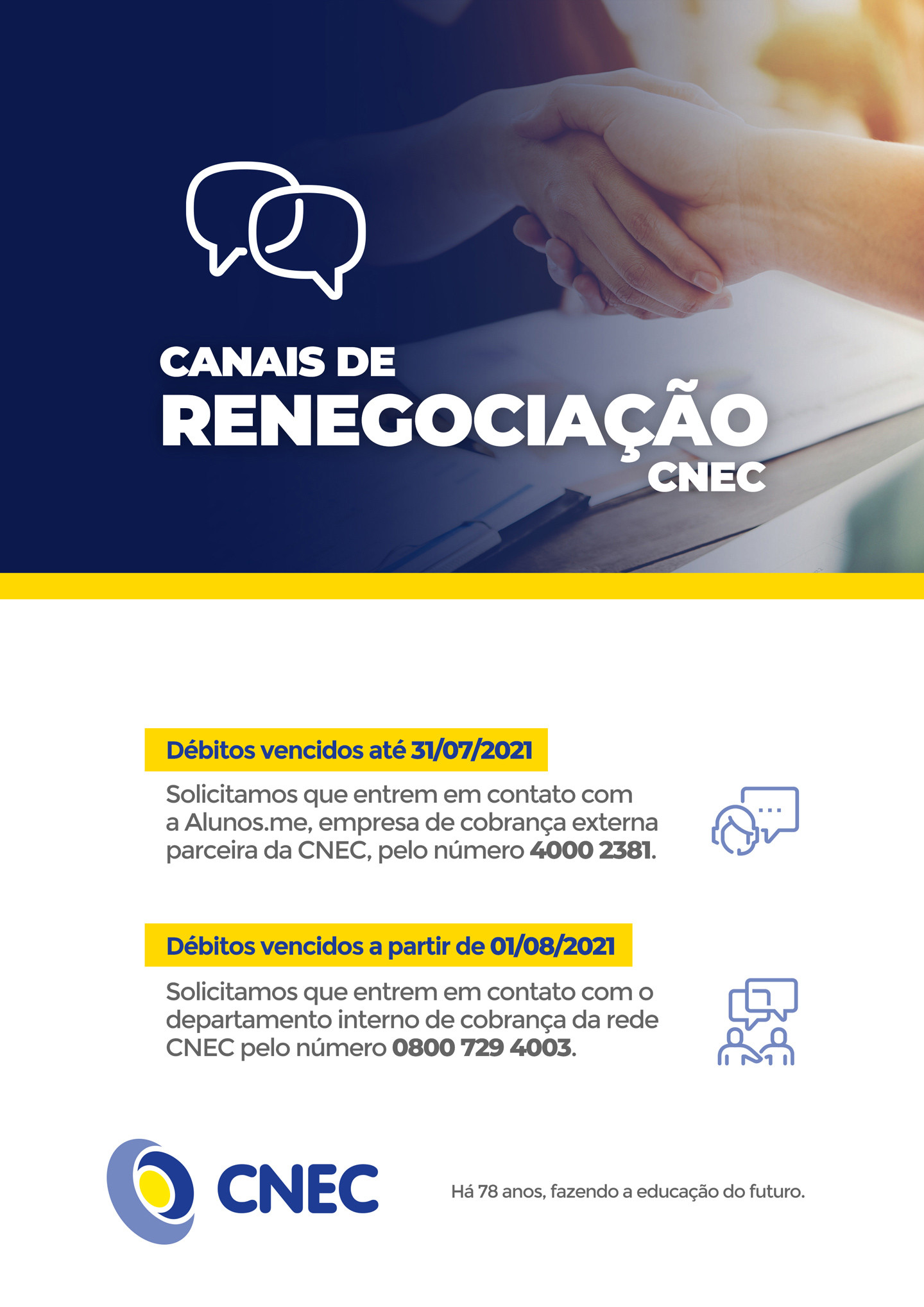 Aos alunos que possuem descontos de 50% ou 100% por meio do processo de bolsas de estudo da CNEC, será realizada a renovação de bolsas de estudo e benefícios complementares, desde que todos os beneficiários continuem a atender aos requisitos do edital. A renovação e concessão de bolsas da Convenção Coletiva de Trabalho ou Acordo Coletivo de Trabalho será realizada conforme descrito na CCT/ACT.